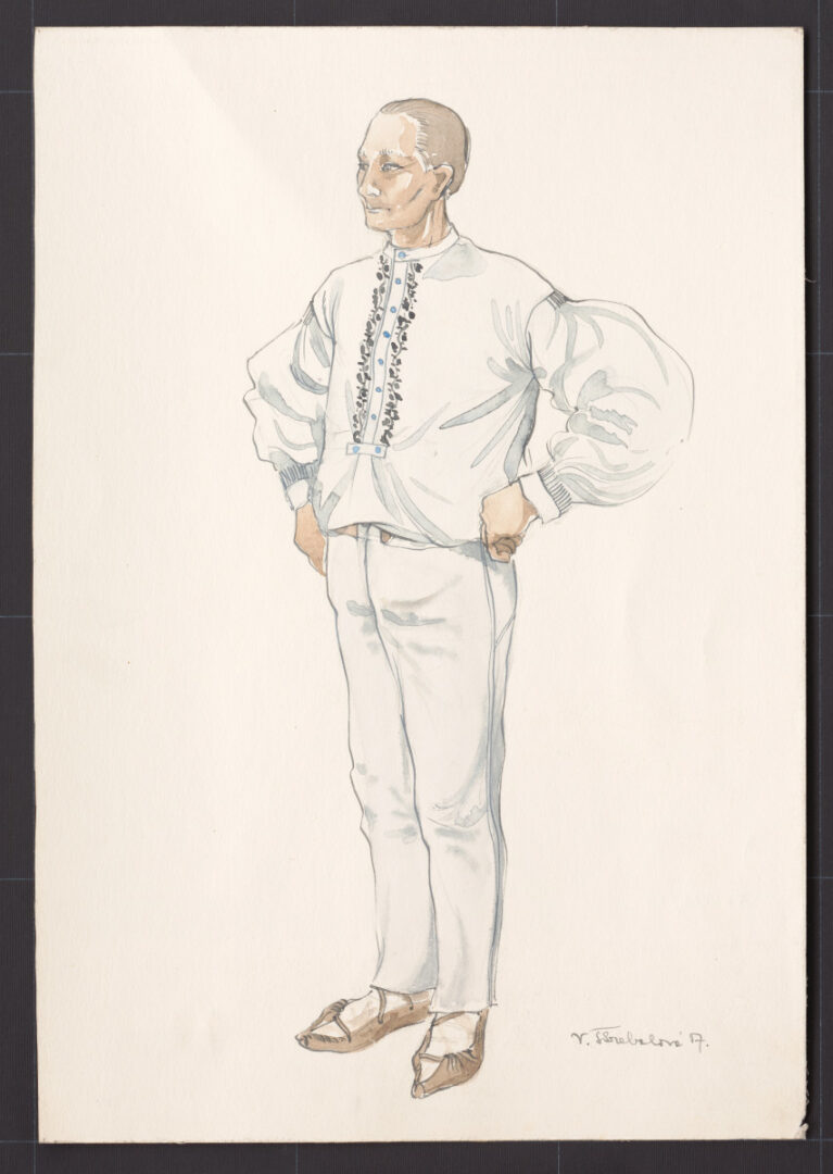 Sviatočný odev muža v letnom období, Čierne nad Topľou, začiatok 20. storočia. Muž má oblečenú košeľu z bavlneného plátna, rovného strihu, s rukávmi kolmo prišitými a stiahnutými do úzkych manžiet, a nohavice z bieleho, doma tkaného bavlneného kepra (drilichu). Na nohách má obuté krpce. Košeľa sa zapína na rad drobných modrých sklenených gombíkov. Pozdĺž zapínania je úzky pás krížikovej výšivky v tmavých farbách. V 19. storočí mala košeľa rovné voľné rukávy, bola bez goliera, bez výšivky a rozparok sa zaväzoval párom šnúrok.