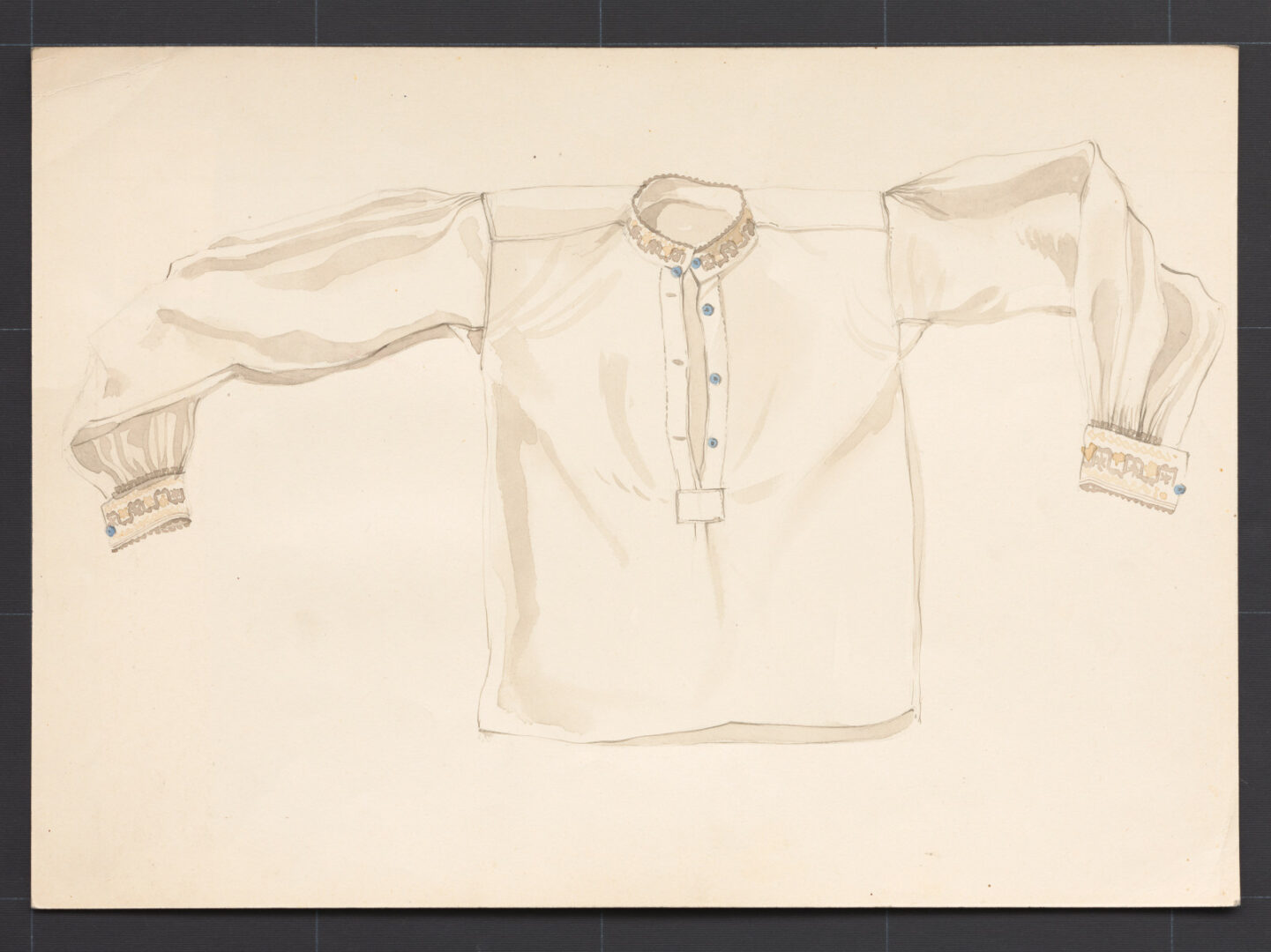 Mužská košeľa, Ábelová, koniec 19. storočia. Košeľa mestského strihu je z bavlneného plátna, s dlhými rukávmi s manžetami a s nízkym stojatým golierom. Golier a manžety zdobí krížiková výšivka. Košeľa predstavuje novšiu formu, ktorá vystriedala koncom 19. storočia krátku košeľu s rovnými rukávmi, ušitú z preloženej jednej poly plátna. Muži ju nosili až do obdobia pred druhou svetovou vojnou.