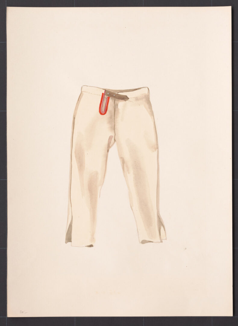 Nohavice, Bzovík, prvá štvrtina 20. storočia. Nohavice sú ušité z hrubšieho domáceho súkna. Majú tradičný strih s jedným bočným švíkom na vonkajšej strane. Červené lemovanie rozparku dokladá, že nohavice boli určené pre slobodného mládenca alebo mladého muža. Starší muži mali rozparok lemovaný čiernym súknom. Súkenné nohavice sa nosili len v zime. Proti chladu sa pod ne ešte obliekali plátenné gate. V priebehu prvej polovice 20. storočia sa nohavice začali šiť z jemnejšieho kupovaného súkna.