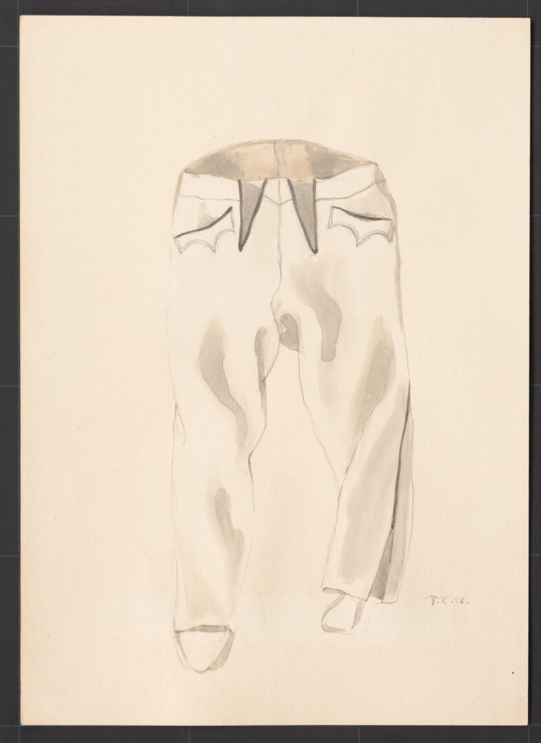 Nohavice, Skačany, prvá štvrtina 20. storočia. Nohavice sú ušité z kupovaného bieleho súkna, tzv. pravnianskeho, ktoré tkali súkenníci v Nitrianskom, pôvodne Nemeckom Pravne. Majú tradičný krojený strih s jedným švíkom na vonkajšej strane. Súkenné nohavice sa nosili len v zime. V lete muži nosili plátenné gate. Biele súkenné nohavice si v prvej štvrtine 20. storočia obliekali už len starší muži. Slobodní mládenci a mladí muži nosili nohavice z čierneho súkna a mestského strihu, so švíkmi na vnútornej i vonkajšej strane.