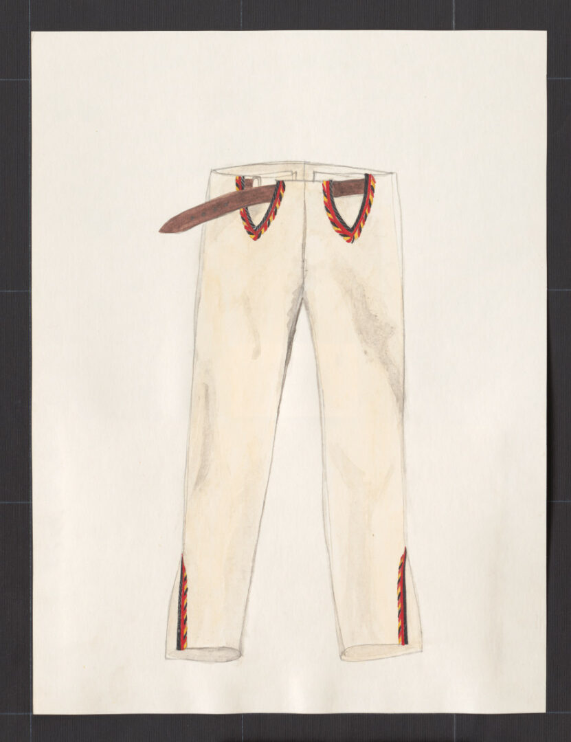Nohavice, Horná Poruba, koniec 19. storočia. Nohavice sú ušité z domáceho súkna. Majú tradičný oblo strihaný strih s bočnými švíkmi, ktoré sa stretajú v zadnej časti nohavíc, kde sa križujú so švíkom, ktorým sú obe nohavice zošité spolu. Na rozparkoch v páse a bočných rozparkoch na nohaviciach sú zdobené našitými farebnými vlnenými šnúrami. Súkenné nohavice nosili muži najmä v zimnom období vo všedné aj sviatočné dni. Začiatkom 20. storočia sa postupne prestávali nosiť a nahrádzali ich nohavice mestského strihu z kepra (cvilichu).