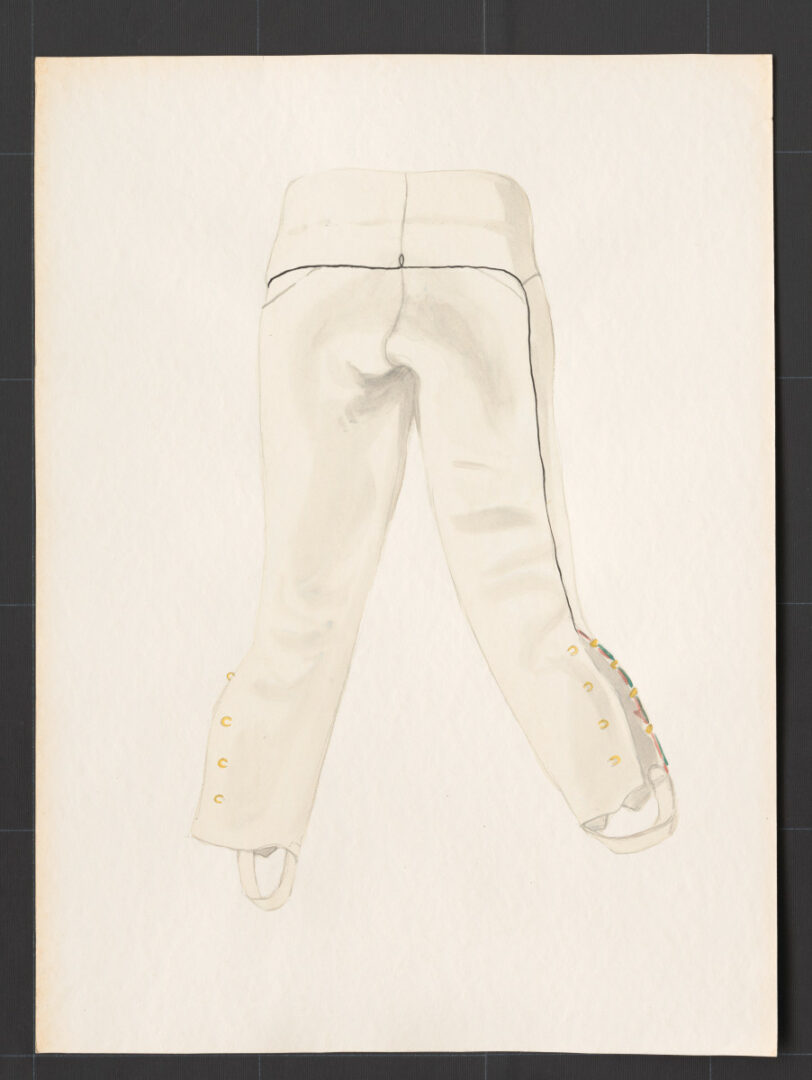 Nohavice, Zázrivá, prvá štvrtina 20. storočia. Nohavice (satínové nohavice) sú ušité z hrubšieho domáceho súkna. Majú tradičný krojený strih. Názov dostali od zosúkaných vlnených šnúrok (satín), ktorými sú zdobené. V priebehu prvej polovice 20. storočia sa začali namiesto šnúrok zdobiť vlnenými stužkami, haraskami. Súkenné nohavice nosili muži po celý rok, v lete i v zime. Vo všedné dni sa nosili menej zdobené, vo sviatočné dni viacej zdobené. Najviac zdobené nohavice mali slobodní mládenci a mladí muži. Zobrazené nohavice boli určené slobodnému mládencovi na sviatočné nosenie.