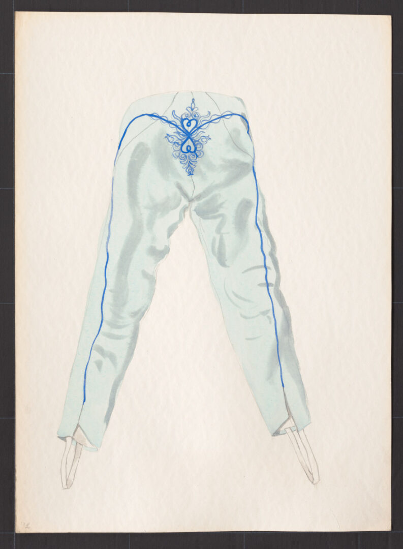 Nohavice, Krakovany, začiatok 20. storočia. Nohavice sú ušité z bledomodrého jemného súkna a podšité bielym hrubším barchetom. Modré šnurovanie okolo rozparkov bolo určené iba na nohavice na sviatočné príležitosti. Mládenci a mladí muži mali výzdobu rozsiahlejšiu a starší muži jednoduchšiu. Podľa rozsahu výzdoby tieto nohavice boli určené pre mládenca alebo mladého muža. Ak sa dávali šiť nohavice na všedné dni, šili sa zo sivého tenkého súkna. V priebehu prvej polovice 20. storočia bledé súkenné nohavice vystriedali čierne štofové nohavice, ktoré mali rovnaký strih a šnurovanie ako bledomodré nohavice.