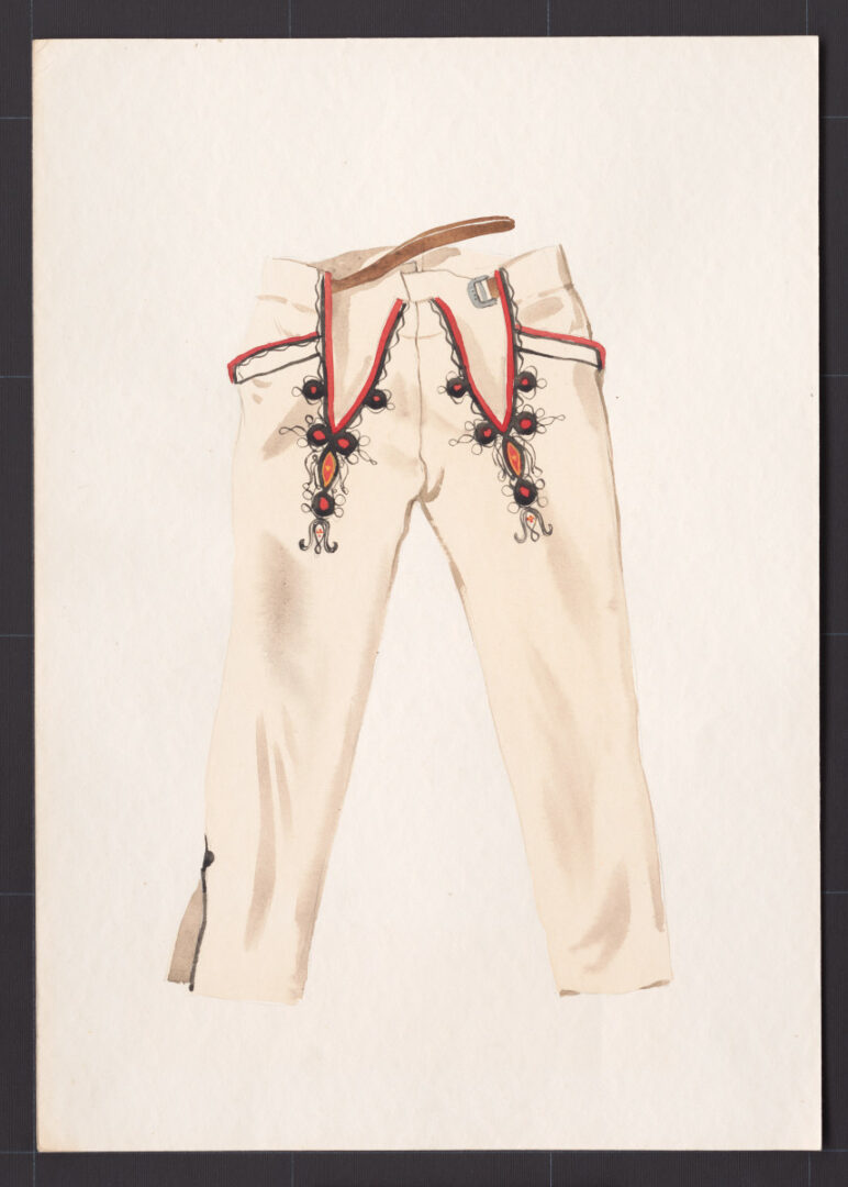 Nohavice, Jalovec, začiatok 20. storočia. Nohavice sú ušité z hrubšieho súkna, ktoré tkali z prinesenej vlny súkenníci v Prievidzi. Okraje rozparkov a vreciek lemujú pásiky jemného červeného súkna. Lemovanie je doplnené šnurovaním čiernou harasovou šnúrkou a stužkou. Najviac zdobené nohavice nosili slobodní mládenci a mladí muži. Súkenné nohavice sa obliekali vo všedné aj sviatočné dni v chladnom období na jar a na jeseň, ale najmä v zime.