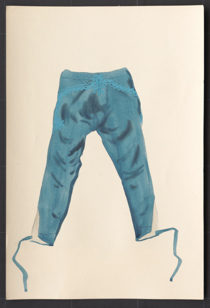 Nohavice, Lubina, začiatok 20. storočia. Nohavice (hunavé nohavice) tradičného strihu sú ušité z bledomodrého tenkého súkna, podšité sú bielym flanelom. Predné časti zdobí šnurovanie z harasovej stužky a šujtáša. Mládenci a mladí muži mali väčšie a starší muži menšie šnurovanie. Nohavice patrili k sviatočným odevným súčiastkam, len staršie, obnosené sa obliekali aj vo všedné dni v zime. V 19. storočí sa v obci nosili biele nohavice z domáceho súkna. Aj tie boli modro šnurované.