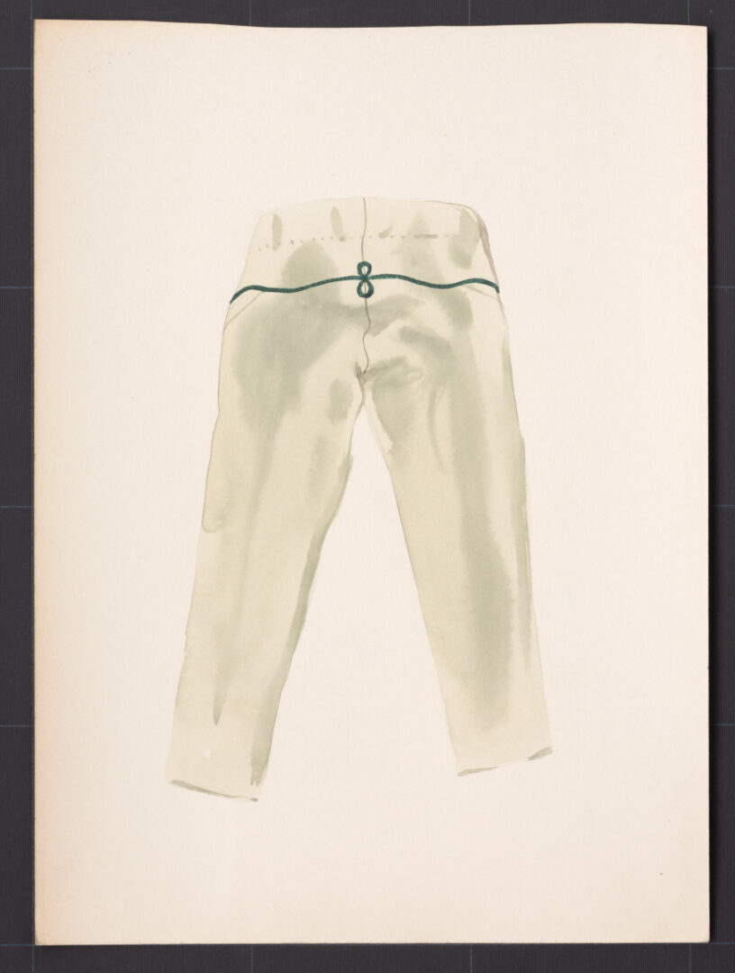 Mužské súkenné nohavice, Horný Vadičov, prvá štvrtina 20. storočia. Nohavice sú ušité z hrubšieho domáceho súkna, ktoré sa dávalo valchovať do Lutíš. Takéto nohavice sa nosili v lete i v zime vo všedné aj sviatočné dni. V páse ich pridŕžal úzky remeň, ktorý mali mládenci vybíjaný kovovými ozdobami. V prvej polovici 20. storočia ich postupne vystriedali nohavice konfekčnej výroby. V tomto období si ich obliekali už len starší muži. Pôvodne sa k súkenným nohaviciam obúvali krpce a súkenné papuče. Po prvej svetovej vojne začali muži nosiť namiesto krpcov a papúč baganče.