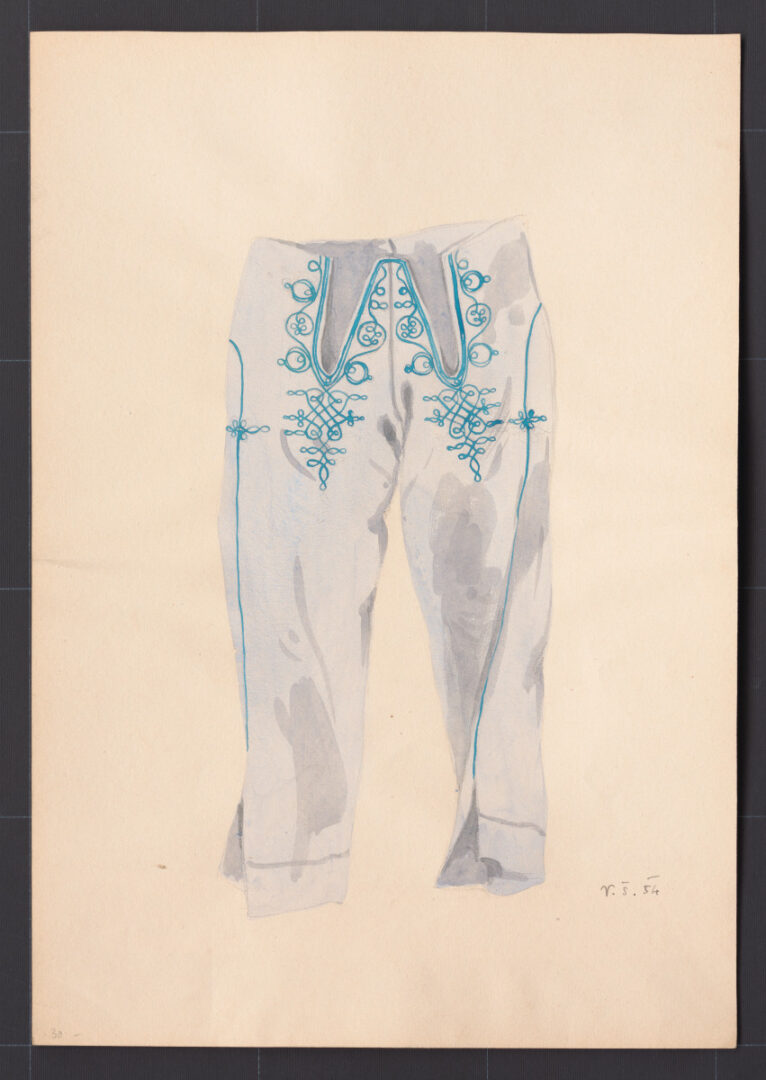 Nohavice, Lamač, začiatok 20. storočia. Nohavice, podšité bielym barchetom, sú ušité zo sivomodrého jemného súkna. Toto súkno sa nazývalo jičínske podľa moravského mesta Nový Jičín, v ktorom krajčíri zvyčajne kupovali súkno na nohavice. Modré šnúrky na šnurovanie sa kupovali v Senici. Nohavice sa nosili vo sviatočné dni v letnom i zimnom období. Ich doplnkom bola zložená väčšia biela vreckovka (šnuptichel), vložená do pravého rozparku nohavíc.