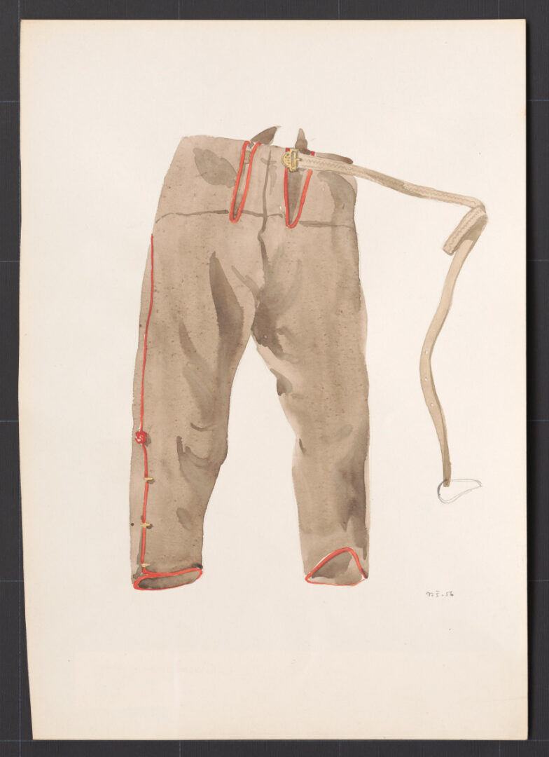 Nohavice, Lazisko, začiatok 20. storočia. Nohavice sú ušité z buravého hrubšieho domáceho súkna. Buravé súkno vzniklo vtedy, keď sa spolu s bielou vlnou spriadla aj tmavá vlna a z nej sa utkalo a splstilo súkno. Rozparky v páse i naspodku nohavíc sú lemované dvomi červenými vlnenými šnúrami. Nohavice v páse pridŕžal úzky a niekedy aj dlhý remeň, ktorý sa dva až tri razy omotal okolo pása. Súkenné nohavice muži nosili počas celého roka, len pri kosení mali namiesto súkenných nohavíc plátenné gate. Okrem tmavého a buravého súkna sa v 19. storočí šili nohavice aj z bieleho súkna. Začiatkom 20. storočia sa už biele súkenné nohavice nenosili.