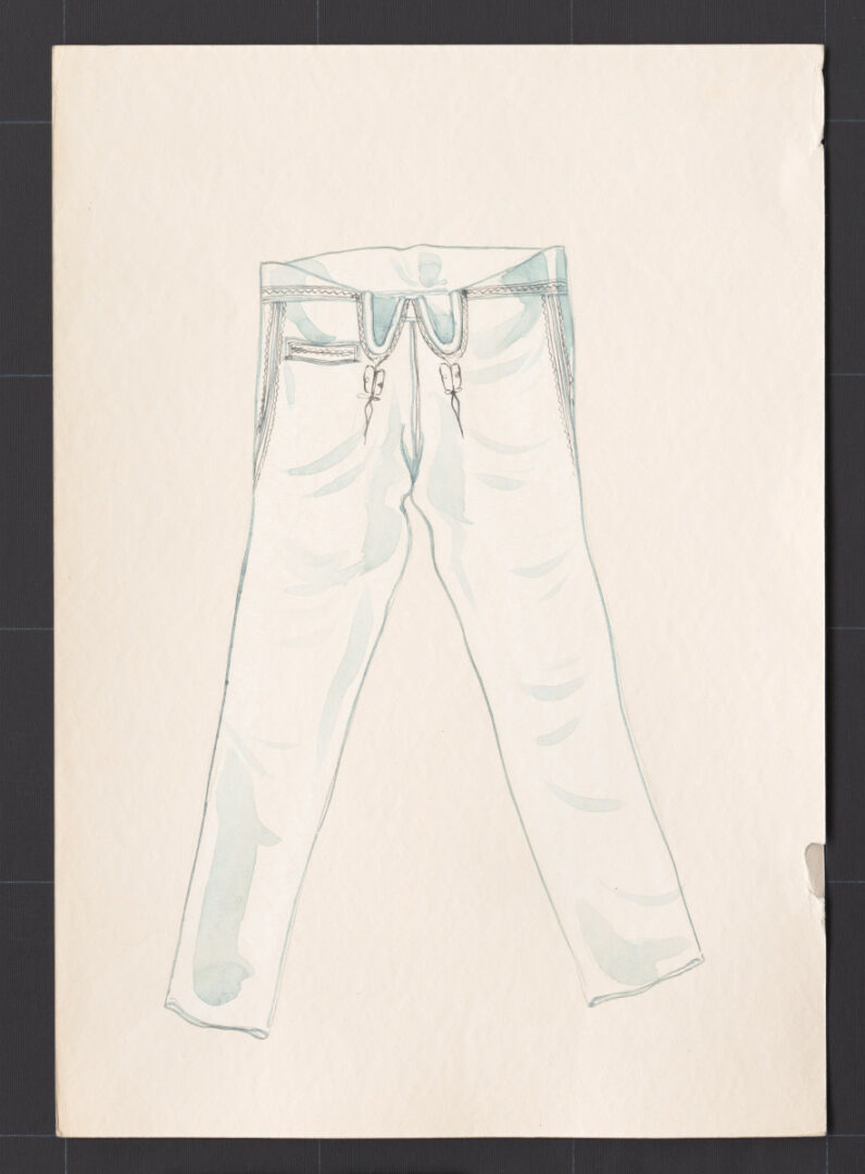 Nohavice na sviatočné dni, Sečovská Polianka, prvá polovica 20. storočia. Nohavice (štapane nohavky) sú ušité z doma tkaného bavlneného kepra (drelichu). Majú tradičný strih so švíkom po vonkajšej strane. Zdobí ich strojové štepovanie čiernou niťou. Názov dostali od spôsobu zdobenia, štapania. Nohavice na všedné dni boli naproti tomu z doma tkaného konopného kepra a nemali výzdobu. Chlapec dostal prvé nohavice vo veku 4-5 rokov.