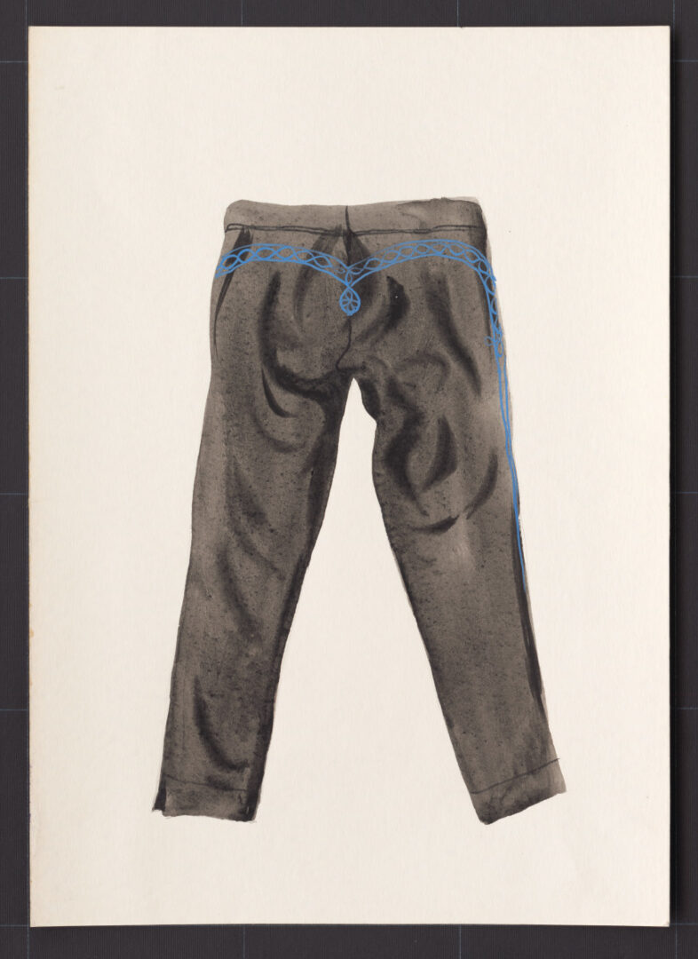 Mužské nohavice, Čataj, začiatok 20. storočia. Nohavice sú ušité z čierneho kangáru. Majú mestský strih, s jedným rozparkom, ktorý sa zapína na dva skryté gombíky, a s dvomi všitými vreckami. Sú mierne zúžené, aby sa dali na ne obuť čižmy. Šnurovanie modrou vlnenou šnúrou, ktoré je na predku nohavíc a napodobňuje výzdobu pôvodných súkenných nohavíc tradičného strihu, sa nachádza aj na bočných švíkoch. Šnurovanie na nohaviciach mali len mládenci. Starší muži nosili nohavice nezdobené. Nohavice z kangáru patrili k sviatočným odevným súčiastkam.