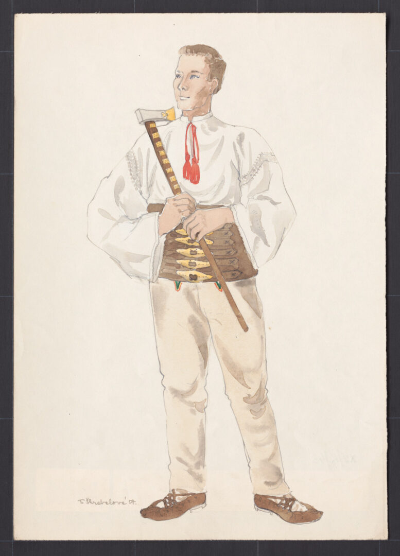 Sviatočný odev slobodného mládenca, Kojšov, začiatok 20. storočia. Mládenec má oblečenú košeľu z domáceho bavlneného plátna, rovného strihu, s rovnými rukávmi, súkenné nohavice a široký kožený opasok s piatimi mosadznými prackami. Obuté má krpce. Široké kožené opasky nosili začiatkom 20. storočia už len mládenci vo sviatok. V priebehu prvej polovice 20. storočia ich nosenie úplne zaniklo.
