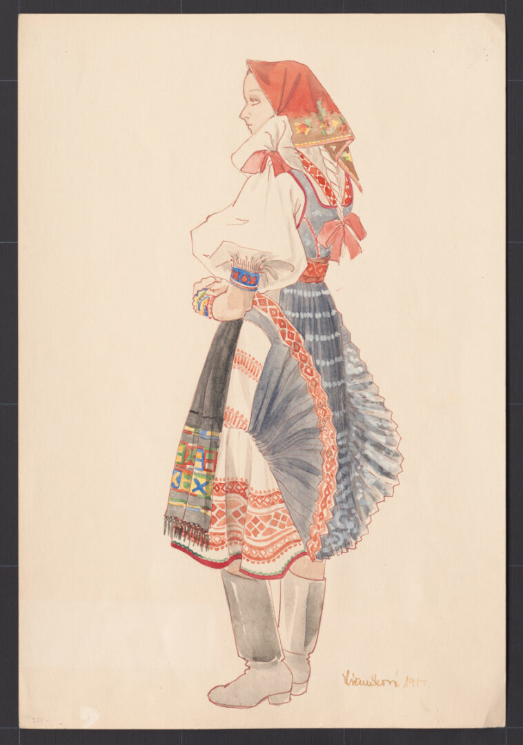 Oblečenie dievčaťa na tanec z 1.polovice 20.storočia.Na košeli a spodnej sukni má dievča oblečenú spodnú sukňu s vytkávaným dolným okrajom. Vrchnú sukňu z modrotlače zošitú so živôtikom má vpredu zakasanú. Cez ňu má previazanú vyšívanú zásteru.