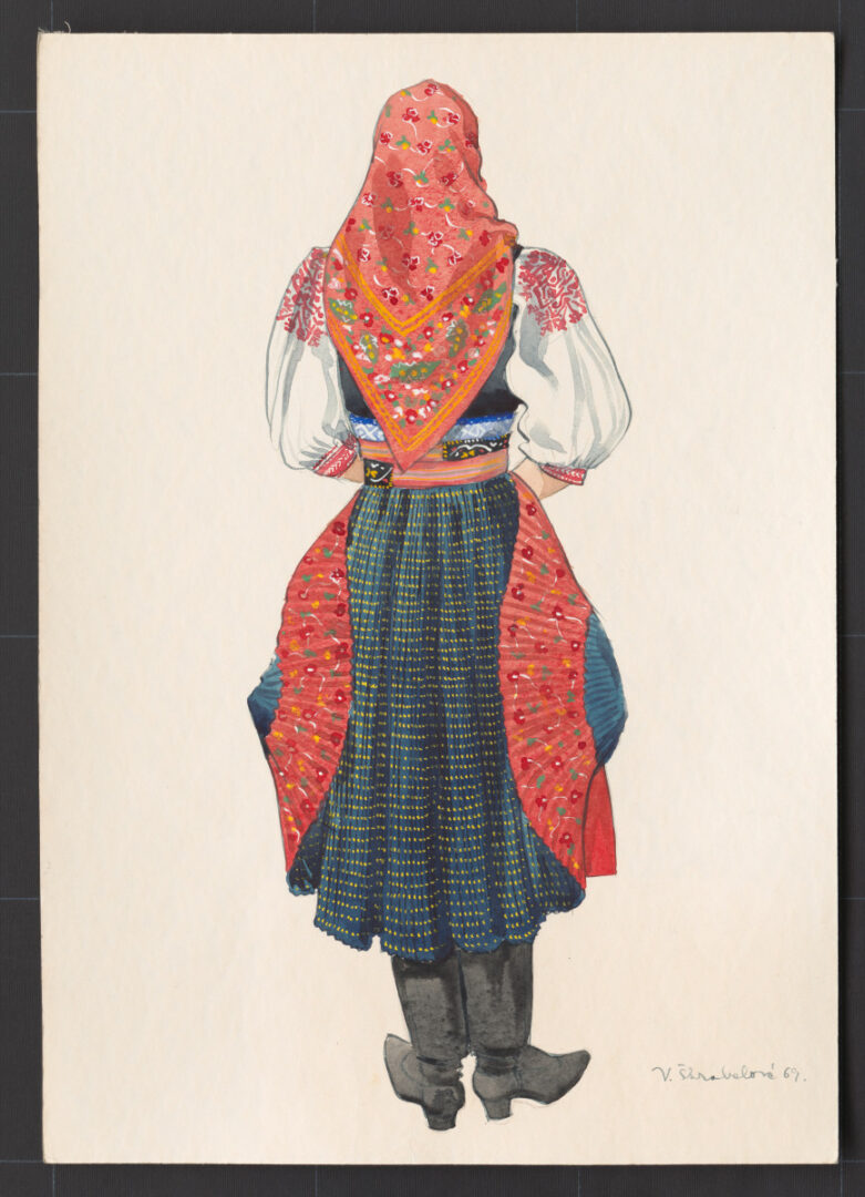 Sviatočný odev slobodného dievčaťa, Kubrá, začiatok 20. storočia. Pohľad zozadu. Dievča má oblečený rubáš, modrotlačovú sukňu so súkenným živôtikom a širokú, pestro vyšívanú zásteru. Na hlave má veľkú kartúnovú šatku s pestrou olejovou potlačou, kožmanický ručník. Obuté má čižmy. Že ide o slobodné dievča alebo o mladú ženu, dokladajú výšivky na rukávcoch a zástere, ako aj vpredu do pása vypnutá sukňa. Takto oblečené a upravené na tanec boli len slobodné dievčatá a mladé ženy.