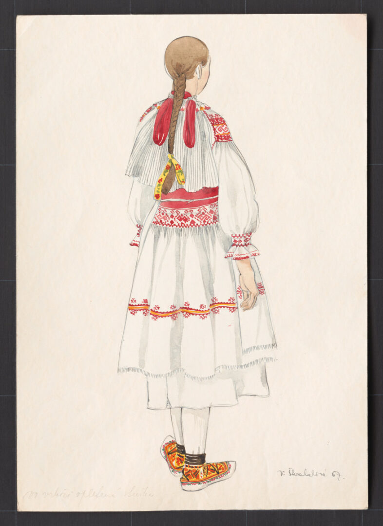 Odev slobodného dievčaťa na tanec, Čičmany, začiatok 20. storočia. Dievča má oblečené rukávce, rubáš (spodník) a na ňom dve zástery – prednú a zadnú. Okolo pása má ovinutý červený vlnený pás. Na všetkých súčiastkach je červená výšivka, ktorá je charakteristická pre odev slobodných dievčat. Sviatočné rukávce sú po celej dĺžke predného aj zadného dielu drobno nazberané, nariasené. Všedné rukávce sa neriasili. Predná a zadná zástera tvorili súčasť predovšetkým všedného odevu. Na hrdle má dievča náhrdelník z fúkaných strieborných perál, ktorý je uviazaný dvomi pradienkami červenej vlny. Obuté má vlnené kopytcia (nohavičky) a nízke súkenné papuče.