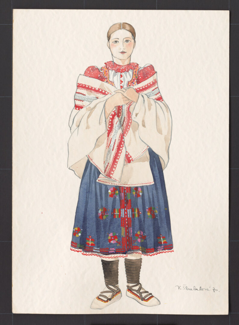 Sviatočný odev slobodného dievčaťa, Horná Poruba, začiatok 20. storočia. Dievča má oblečený rubáš (spodník), na ňom červenou vlnou vyšívané rukávce a sukňu so živôtikom (rubáč), prepásaný červeným vlneným pásom. Vo všedné dni sa nosil čierny pás. Na sukni má dievča opásanú širokú zásteru, ušitú z dvoch pôl farbiarskeho plátna, ktorá je vyšívaná. Vo všedné dni sa nosili nevyšívané zástery. Cez plecia má dievča prehodenú odevnú plachtu (prosteradlo). Odevná plachta bola z dvoch pôl domáceho konopného plátna, zošitých pásom bielej čipky, pozdĺž ktorej boli pásy výšivky. Skladala sa tak, aby čipku a výšivku bolo vidieť. Nosila sa len doobeda.