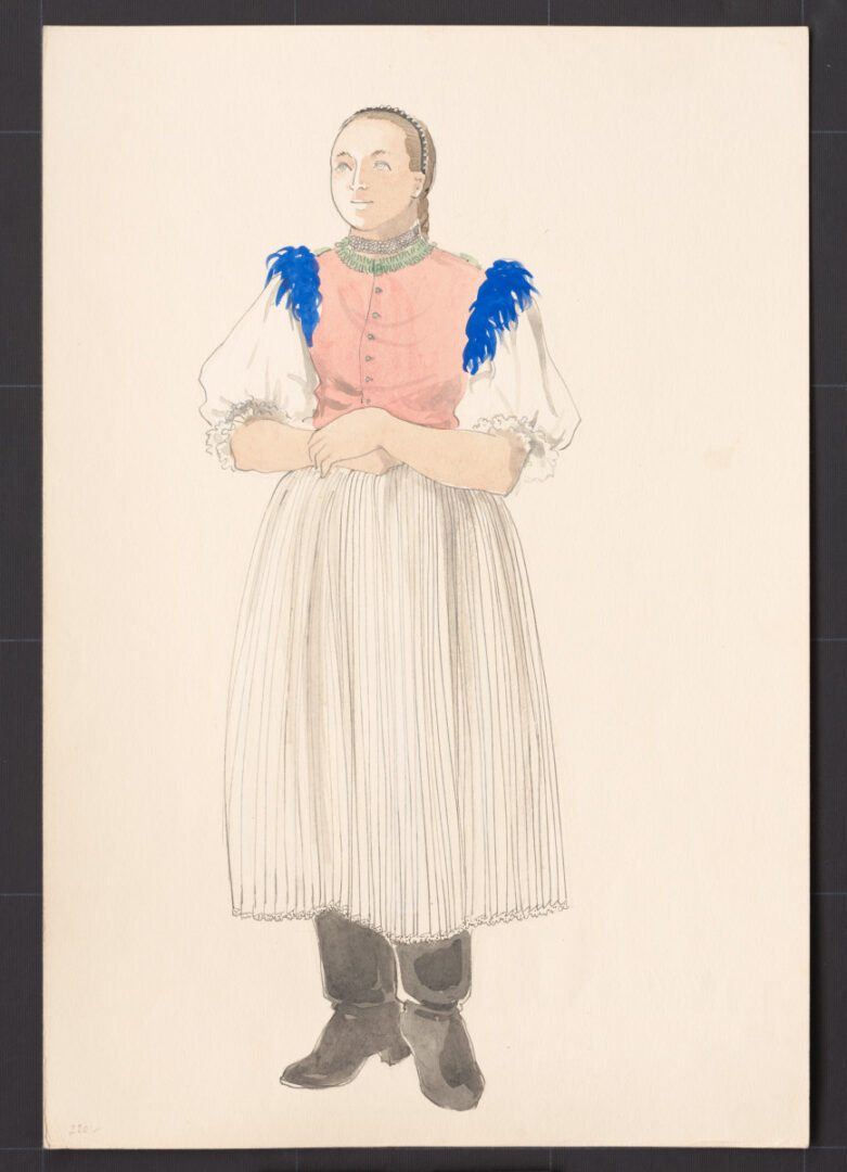 Sviatočný odev, ktorý nosili dievčatá v polovici 20.storočia. Sukňa, zástera a živôtik boli z umelohodvábneho materiálu.