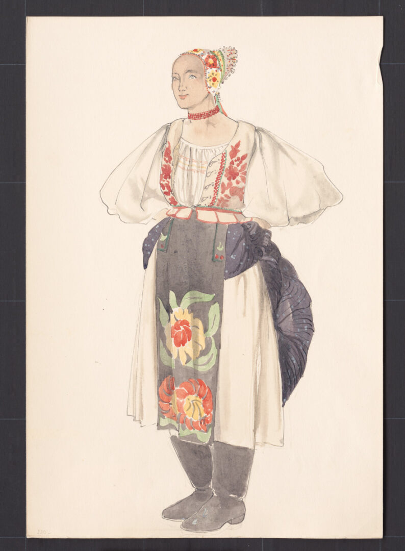 Sviatočný odev mladej ženy. Pohľad spredu. Druhá štvrtina 20. storočia. Žena má oblečené rukávce (oplecko) a rubáš (pentlík) – oboje z tenšieho kupovaného bavlneného plátna, ďalej kožuštek (kožušanku), vrchnú sukňu (kidľu) z modrotlače a úzku glotovú zásteru s veľkou farebnou výšivkou kvetov na spodnom okraji. Na hlave má založený čepiec. Takto oblečená bývala mladá žena na druhý deň po svadbe. Vykasaná predná pola sukne naznačuje, že už ide o všedný deň. Na časové obdobie poukazuje farebnosť čepca a úzka glotová zástera, ktorá v priebehu druhej štvrtiny 20. storočia nahradila pôvodnú širokú zásteru z dvoch pôl bielo vzorovanej modrotlače.