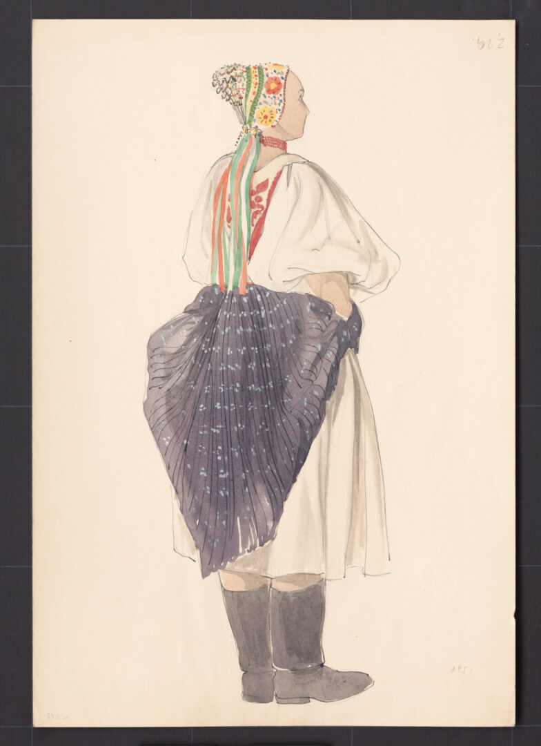 Sviatočný odev mladej ženy. Pohľad zozadu. Druhá štvrtina 20. storočia. Žena má oblečené rukávce (oplecko) a rubáš (pentlík) – oboje z tenšieho kupovaného bavlneného plátna, ďalej kožuštek (kožušanku), vrchnú sukňu (kidľu) z modrotlače a úzku glotovú zásteru s veľkou farebnou výšivkou kvetov na spodnom okraji. Na hlave má založený čepiec. Takto oblečená bývala mladá žena na druhý deň po svadbe. Vykasaná predná pola sukne naznačuje, že už ide o všedný deň. Na časové obdobie poukazuje farebnosť čepca a úzka glotová zástera, ktorá v priebehu druhej štvrtiny 20. storočia nahradila pôvodnú širokú zásteru z dvoch pôl bielo vzorovanej modrotlače.