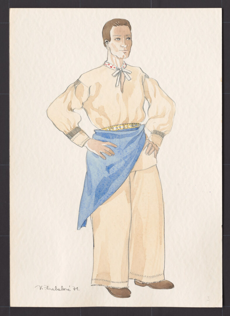 Sviatočný odev muža v letnom období, Studienka, začiatok 20. storočia. Odev zložený z konopnej košele, gatí a zo zástery nebol len odevom na všedné dni v letnom období. Ak bola košeľa, gate i zástera novšie a neobnosené, mohli v nich byť muži oblečení aj v nedeľu odpoludnia. Vo sviatočný deň bola zástera vždy jedným koncom zakasaná za pásom. Takto oblečení mohli ísť mládenci aj na tanečnú zábavu.