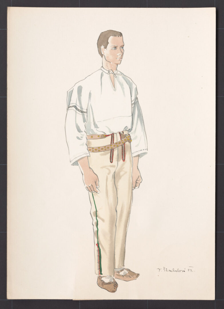 Mládenecký letný kroj, Horný Vadičov, chýba storočie. Nosil sa do prvej svetovej vojny. Mládenec má oblečenú ľanovú košeľu a súkenné nohavice s dlhým remeňom.