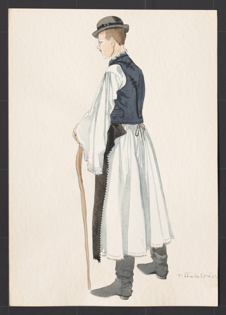 Sviatočný odev mladého muža, Veľký Blh, druhá polovica 19. storočia. Muž má oblečenú košeľu z tenkého bavlneného plátna s voľnými širokými rukávmi a gate z hrubšieho domáceho bavlneného plátna. Opásanú má úzku zásteru z tmavého farbiarskeho plátna. Na košeli má tmavomodrý súkenný lajblík zdobený šnurovaním. Okolo hrdla má uviazanú čiernu hodvábnu mužskú šatku. Takto oblečení bývali v lete vo sviatočné dni nielen mladí muži, ale aj slobodní mládenci.