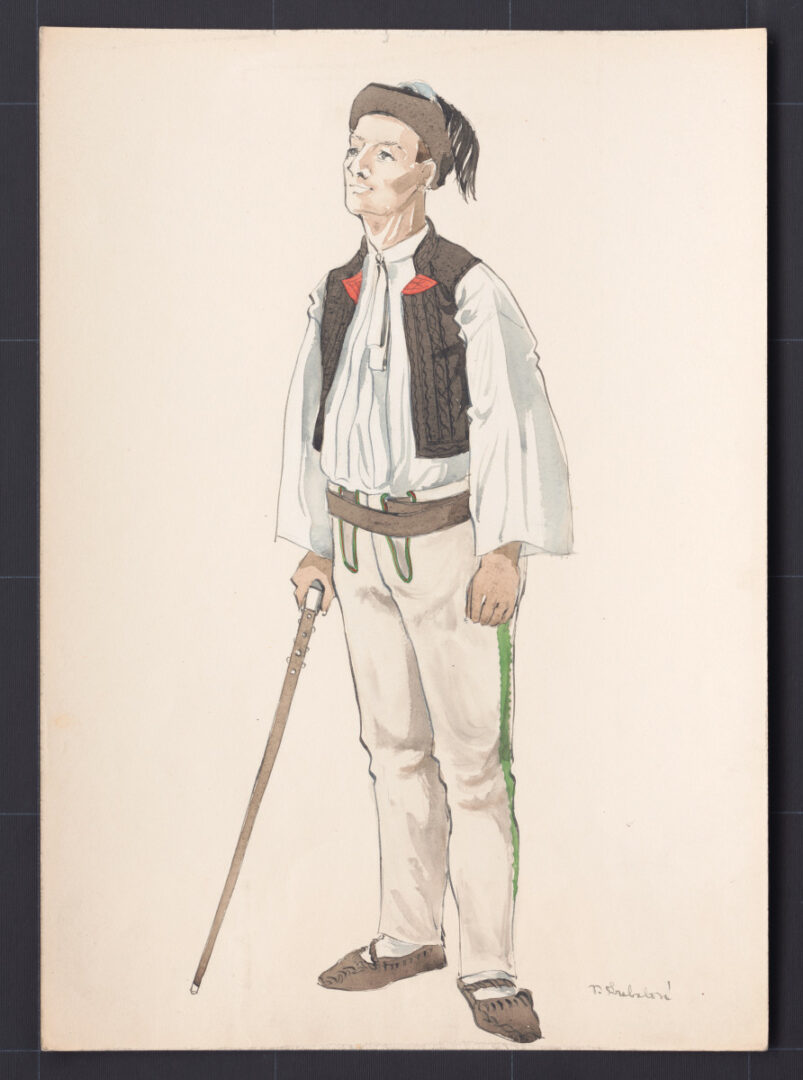 Sviatočný odev slobodného mládenca, Terchová, prvá štvrtina 20. storočia. Mládenec má oblečenú košeľu rovného strihu z tenkého domáceho ľanového plátna a súkenné nohavice i lajblík z tenšieho továrenského súkna. Na hlave má mladšiu formu klobúka s úzkou, dohora vyhnutou strieškou. Na klobúku má pripnuté čierne pštrosie pero ozdobené perličkami. Že ide o slobodného mládenca, dokladá okrem klobúka aj šírka zeleného šnurovania cez bočné švíky súkenných nohavíc. Slobodní mládenci mali šnurovanie široké a ženatí muži úzke.