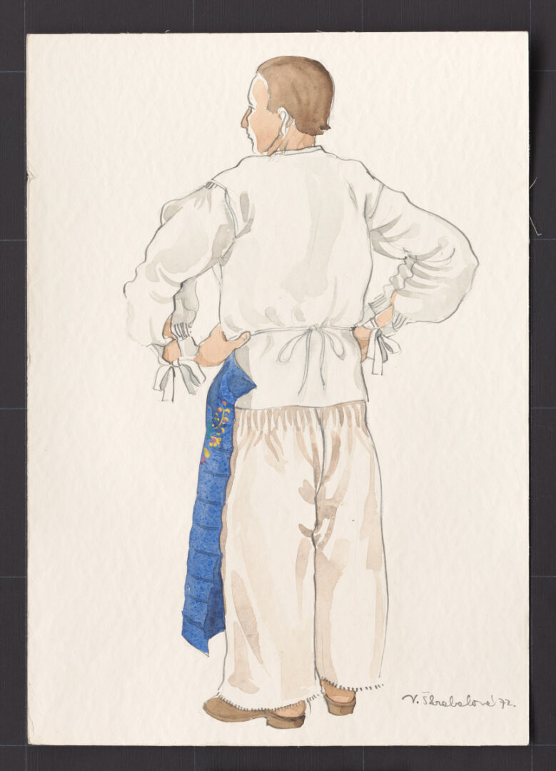 Sviatočný odev slobodného mládenca v letnom období, Močenok, prvá polovica 20. storočia. Mládenec má oblečenú košeľu z domáceho bavlneného plátna, gate z konopného plátna a úzku modrú mužskú zásteru, ktorej jeden roh by mal mať zastrčený za pás. Obuté má kožené pantofle. K úplnosti jeho oblečenia ešte chýba klobúk s pierkom zo živých kvetov. Dokladom, že ide o slobodného mládenca, je košeľa tradičného rovného strihu z domáceho bavlneného plátna. Ženatí muži v tom období už nosili košele mestského strihu.