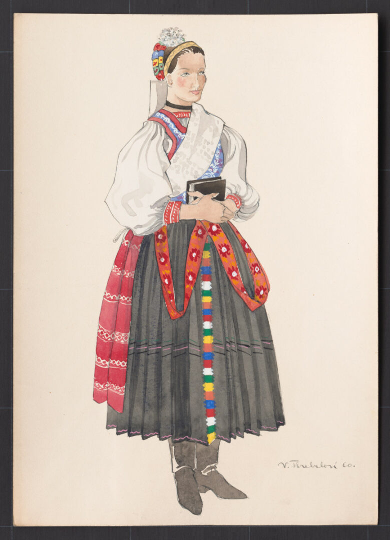 Svadobný odev mladuchy, Šarišské Sokolovce, prvá štvrtina 20. storočia. Mladucha má oblečenú dlhú košeľu, ktorej rukávy sú z bavlneného a driek z domáceho ľanového plátna, dve spodné biele sukne a vrchnú sukňu z tmavého farbiarskeho plátna. Na košeli má brokátový živôtik a na sukni opásanú širokú zásteru. K znakom svadobného odevu patrí parta, ktorú má mladucha na hlave, a dlhá úzka plátenná šatka (pôlka), uviazaná cez ľavé plece a hruď. Konce pôlky zdobí široký pás červeného vytkávania. Vydaté ženy nosili v pôlke malé deti.
