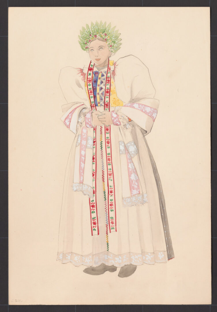 Mladucha v odeve na sobáš v prvej polovici 20.storočia. Na košeli s dlhými rukávmi má oblečenú modrotlačovú sukňu, bielu zásteru a hodvábny živôtik. Na hlave má veniec, o koreň vrkoča pripevnené stuhy, z ktorých dva konce visia vpredu. Cez ruky má preloženú poskladanú obradovú plachtu, prestieradlo.
