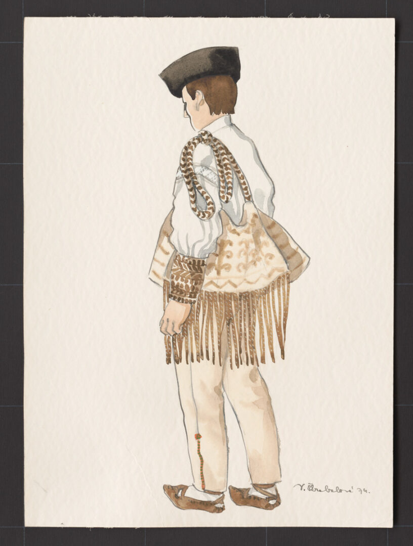 Všedný odev muža, Čierny Balog, začiatok 20. storočia. Takto bol muž oblečený, keď odchádzal na týždňovú prácu v lese. Muž má oblečenú ľanovú košeľu s rukávmi zastrčenými do zápästiek a súkenné nohavice. V páse vidno remeň, ktorým má upevnené nohavice. Nad nohavicami má opásaný široký kožený opasok, ktorý v minulosti patril k sviatočnému aj pracovnému odevu. Pri namáhavej práci v lese s drevom chránil mužovi bedrá. Zápästky tiež patrili k sviatočnému aj pracovnému odevu mužov. Pri práci chránili zápästie pred poranením. Na pleci má muž zavesenú vlnenú kapsu (cedilo), v ktorej sa nosili do lesa potraviny na celý týždeň. Plná kapsa sa nosila prehodená cez obe plecia, prázdna zavesená na jednom pleci.