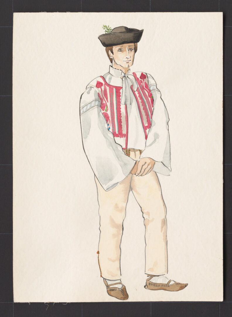 Sviatočný odev slobodného mládenca, Čierny Balog, začiatok 20. storočia. Mládenec má oblečenú ľanovú košeľu rovného strihu, s rovnými rukávmi a súkenné nohavice. Na košeli má oblečený kožuštek z bielej barančiny, zdobený aplikáciami z červenej irchy. Že ide o sviatočný odev, svedčí strih košele, ktorá má rukávy prišité pomocou čipkovej mriežky. Sviatočné košele sa šili z tenkého ľanového plátna. Nové a neobnosené kožušteky sa nosili vo sviatočné dni, kým obnosené a staršie vo všedné dni. Kožušteky sa kupovali u kožušníka v Brezne.