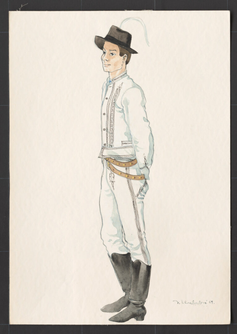 Sviatočný odev mládenca v chladnom období, Sečovská Polianka, prvá polovica 20. storočia. Mládenec má oblečenú košeľu z bieleho bavlneného plátna, zdobenú na hrudi čiernou krížikovou výšivkou, spodné konopné gate a na nich vrchné nohavice z bavlneného kepra, zdobené čiernym strojovým štepovaním. Na košeli má kabátik z bieleho bavlneného kepra a na hlave klobúk s pierkom. Pod kabátik sa lajblík neobliekal. Mládenec má obuté čižmy s tvrdými sárami. Do úplnosti sviatočného oblečenia ešte chýba vo vrecku nohavíc vložená mládenecká šatôčka. Šatôčka bola z bieleho bavlneného plátna, okrúhleho tvaru, dookola pestrofarebne obháčkovaná. V minulosti mali mládenci na opätkoch čižiem upevnené ostrohy.