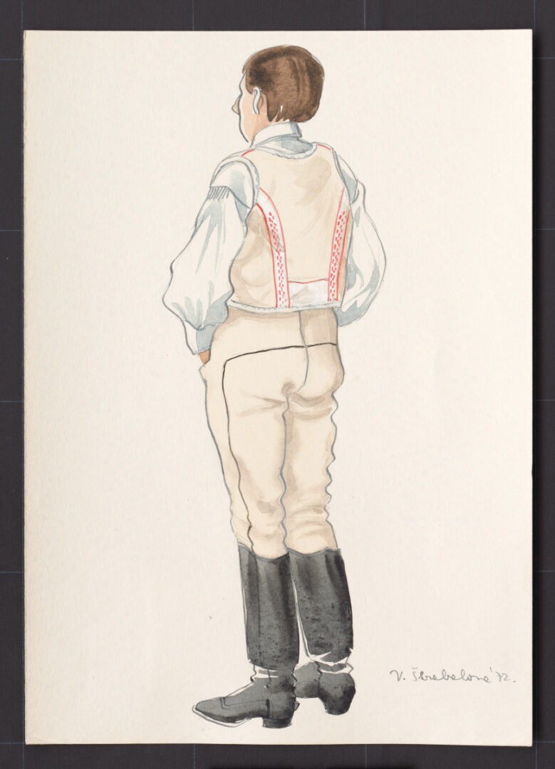 Sviatočný odev muža v zimnom období, Spišský Štvrtok, prvá štvrtina 20. storočia. Muž má oblečenú novšiu formu plátennej košele, súkenné nohavice a kožuštek z bielej ovčej kožušiny (serdak). Obuté má čižmy. Košeľa je z kupovaného bavlneného plátna a svojím strihom nadväzuje na strih mestskej košele. Pôvodná košeľa mala rovný strih s rovnými, voľnými rukávmi. Charakteristickým znakom mužských čižiem je do tvaru srdca vykrojený horný okraj sár.
