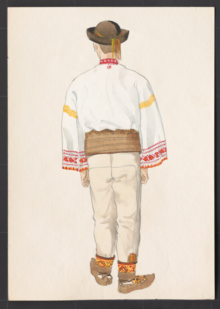 Sviatočný odev mládenca v zimnom období, začiatok 20. storočia. Mládenec má oblečenú košeľu z bavlneného plátna, súkenné nohavice a široký kožený opasok. Na hlave má klobúk. Obuté má krpce a v nich pletené vlnené kopytcia. Na sviatočný charakter odevu poukazuje bohato vyšívaná košeľa a široký opasok. Že ide o odev mládenca, hovorí červená farba výšivky, ktorú mali na košeliach len mládenci alebo mladí muži. Na zimný charakter odevu poukazujú súkenné nohavice a krpce s vlnenými kopytciami. K úplnosti zimného odevu by ešte patrila cez plecia prehodená huňa.