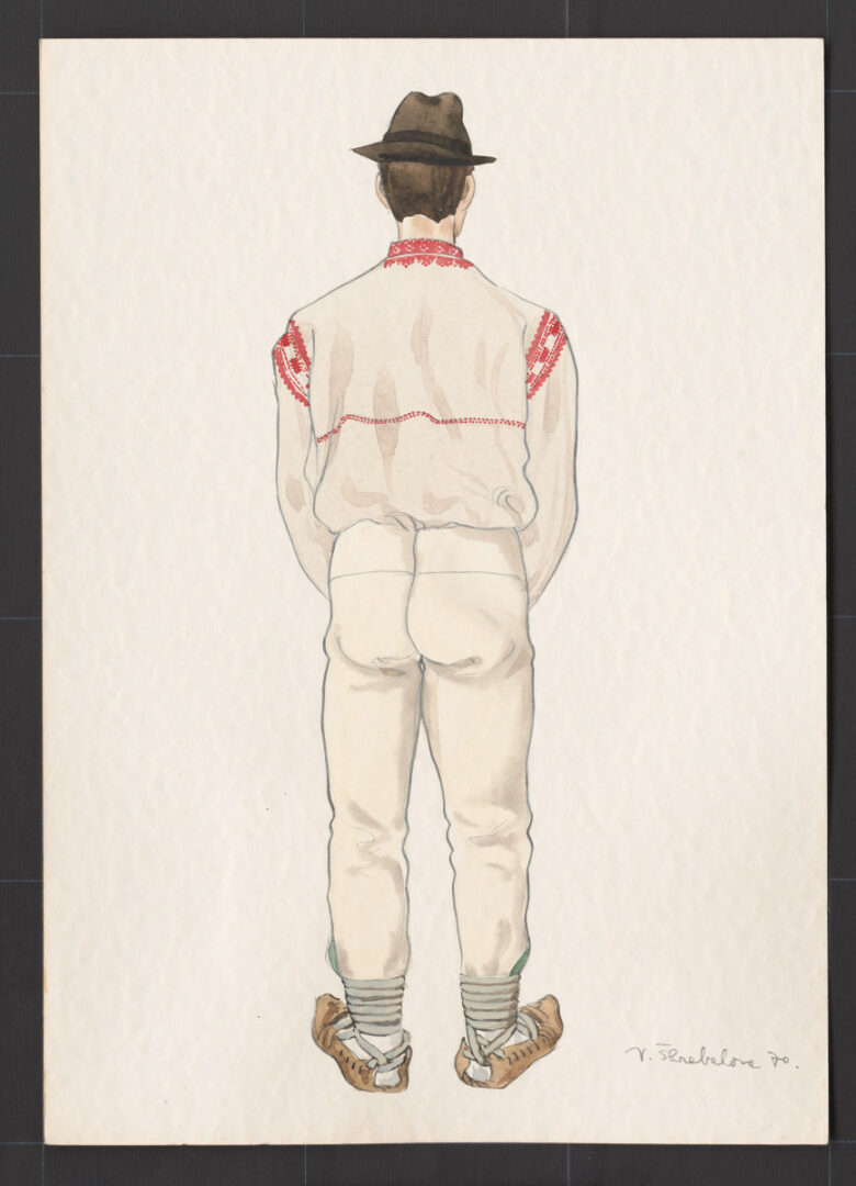 Všedný odev muža v letnom období, Horná Poruba, začiatok 20. storočia. Muž má oblečenú košeľu a gate, oboje z domáceho konopného plátna. Aj vo všedné dni nosili muži košele zdobené výšivkou. V priebehu prvej polovice 20. storočia sa košele prestali vyšívať a plátenné gate nahradili plátenné nohavice mestského strihu.