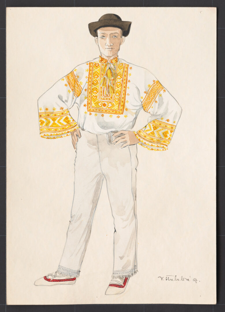 Sviatočný odev mladého muža v letnom období, Čičmany, druhá štvrtina 20. storočia. Muž má oblečenú košeľu a plátenné nohavice, oboje ušité z domáceho ľanového plátna. Na sviatočný charakter odevu poukazuje rozsiahla žlto-oranžová výšivka okolo rozparka košele a na jej rukávoch, ako aj široká čipková mriežka spájajúca rukávy s košeľou. Na letný charakter odevu poukazujú plátenné nohavice, ktoré sa nosili len v lete, a súkenné papuče s onucami, ktoré sa tiež nosili iba v lete. V zimnom období muži nosili súkenné nohavice a mali obuté papuče alebo krpce s vlnenými kopytciami.