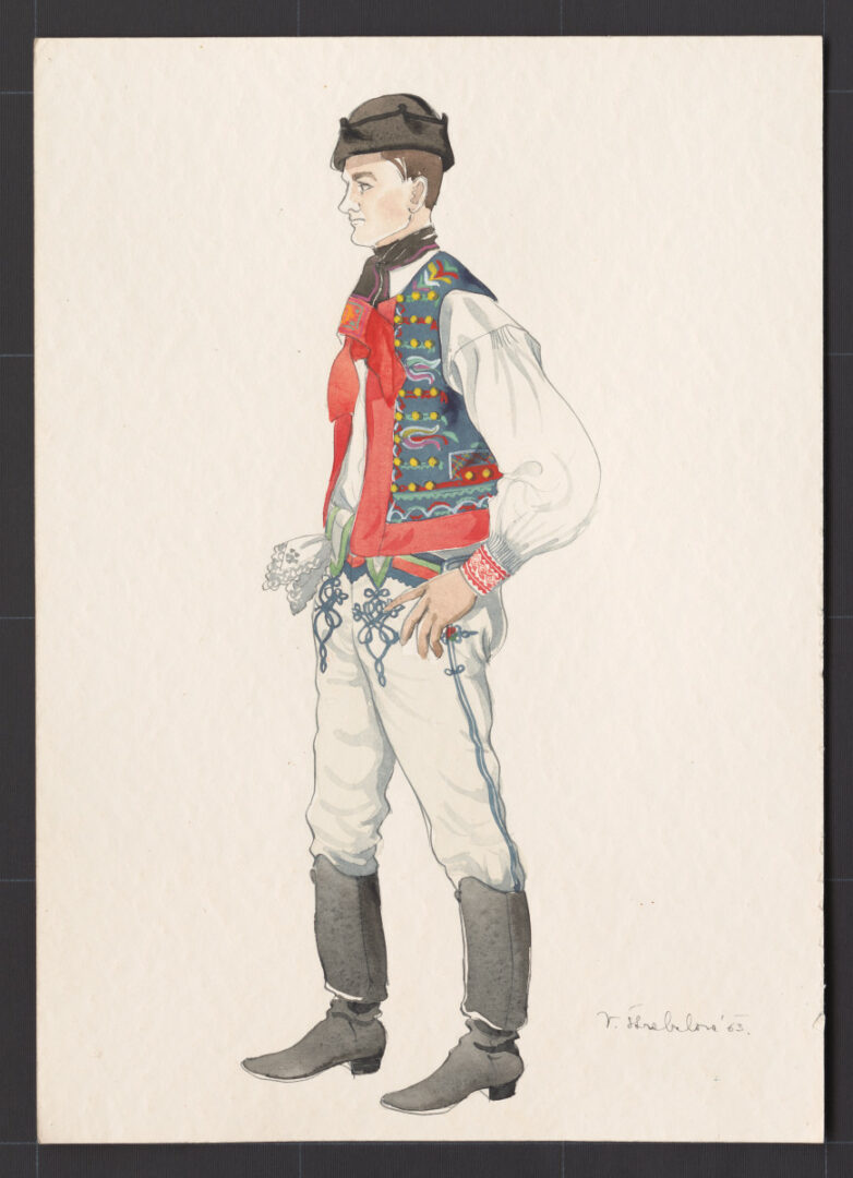 Sviatočný odev slobodného mládenca, Ličartovce, začiatok 20. storočia. Muž má oblečenú bielu plátennú košeľu, biele nohavice z bavlneného kepra, drilichu, a lajblík z tenkého modrého súkna. Na hrdle má uviazanú mužskú šatku na hrdlo (hajštuk). Šatku tvorila široká čierna polohodvábna stuha, na ktorej konce boli priečne prišité červené stužky. V pravom rozparku nohavíc má muž zastrčenú ozdobnú bielu vreckovku. Sviatočnou obuvou boli čižmy, ktoré mali horný okraj sár vykrojený do tvaru srdca. Podobný odev nosili vo sviatočné dni aj mladí ženatí muži.
