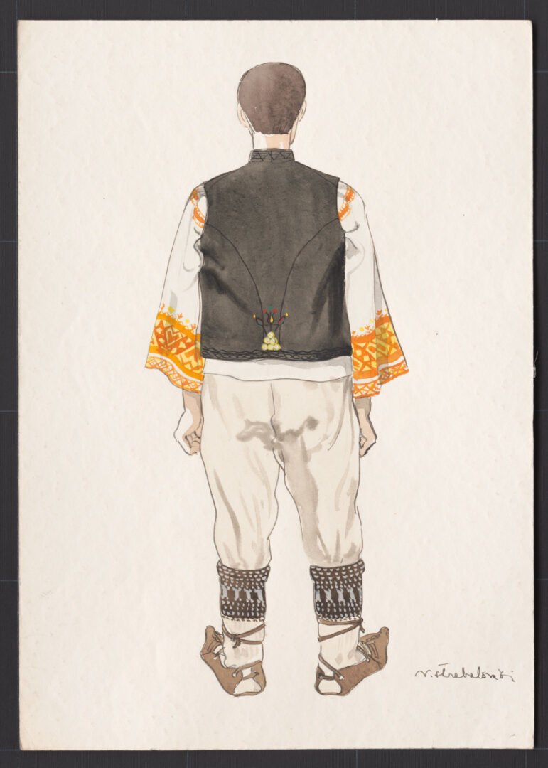 Sviatočný odev muža v zimnom období, Skýcov, začiatok 20. storočia. Muž má oblečenú košeľu rovného strihu z hrubšieho bavlneného plátna, nohavice z bieleho súkna a lajblík z jemného čierneho súkna. Obuté má krpce a v nich kopytcia – hrubé pančuchy upletené z domácej ovčej vlny. Že ide o sviatočný odev, dokladá široký pás výšivky na rukávoch košele a lajblík. Vo všedné dni si muži lajblík neobliekali a rukávy košele mali bez výšivky. Košeľa sa do gatí ani do nohavíc nezakasávala.