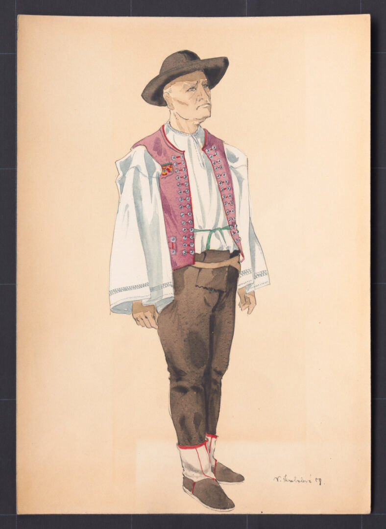 Sviatočný odev muža, Záriečie, prvá štvrtina 20. storočia. Muž má oblečenú košeľu z jemného bavlneného plátna, rovného strihu, s rovnými, voľnými rukávmi, súkenné nohavice z kupovaného súkna a lajblík s dvoma radmi kovových gombíkov. K sviatočnému oblečeniu patril klobúk so širokou strieškou a súkenné papuče. Vo všedné dni nosili muži košele z hrubšieho balvneného plátna a staršie, obnosené súkenné nohavice z tmavého domáceho súkna.