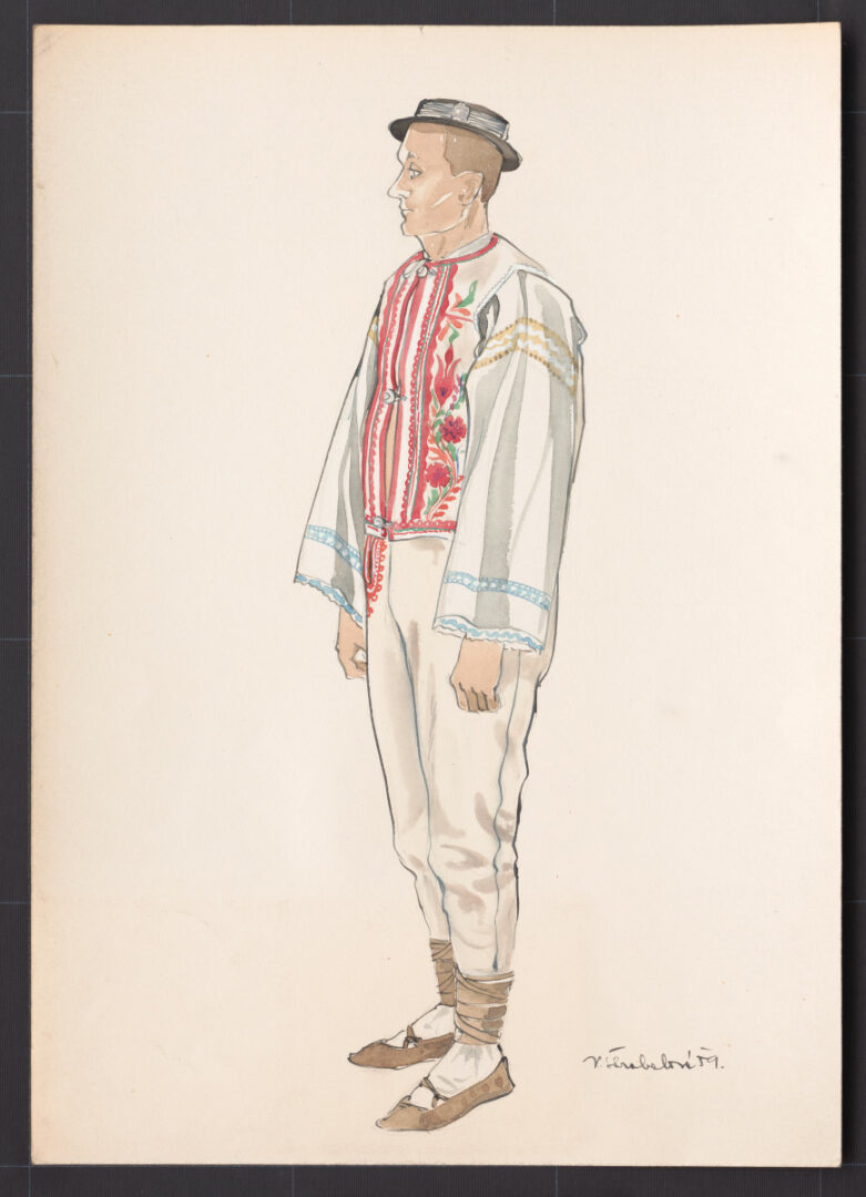 Sviatočný odev slobodného mládenca v zimnom období, Poniky, začiatok 20. storočia. Muž má oblečenú plátennú košeľu, biele súkenné nohavice a kožuštek z bielej ovčej kožušiny. Cez plecia by ešte mal mať prehodenú čiernu súkennú kabanicu. Kabanicu nosili muži počas celého roka, kožuštek najmä v zimnom období. Kovové retiazky okolo dienka klobúka naznačujú, že ide o slobodného mládenca. Ženatí muži mali na klobúku pásik červenej irchy. Modrá výšivka na rukávoch košele sa začala používať až začiatkom 20. storočia. Dovtedy prevládala biela výšivka alebo výšivka vo farbe zrebnej konopnej nite.
