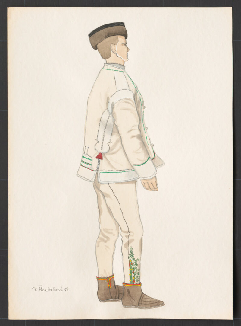 Vrchný odev muža v zimnom období, Zázrivá, začiatok 20. storočia. Muž má na základnom odeve, ktorý pozostáva z košele, kožušteka a zo súkenných nohavíc, oblečený kožuch s rukávmi. Takýto kožuch bol sviatočnou odevnou súčiastkou. Vo všedné dni sa nosil len výnimočne, aj to už musel byť veľmi starý, obnosený. Muž má obuté súkenné papuče s nízkou sárou, janičiarky.