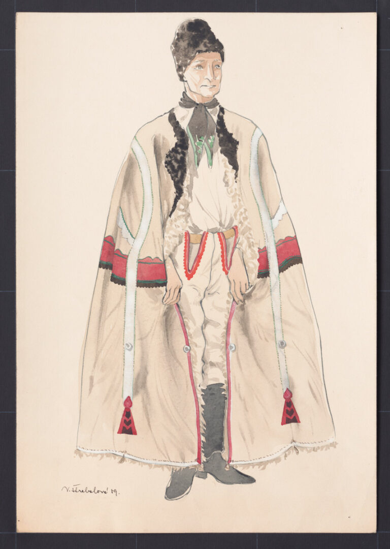 Vrchný odev muža v zimnom období, Dvorníky, začiatok 20. storočia. Muž má na základnom odeve, ktorý pozostáva z bavlnenej košele a zo súkenných nohavíc, cez plecia prehodenú bundu – kožušinovú pelerínu bez rukávov. Bunda je ušitá zo štyroch veľkých bielych ovčích koží a z jednej malej čiernej jahňacej kože, z ktorej je zhotovený golier. Švíky na bunde sú prekryté pásikmi bielej irchy. Jedinou ozdobou bundy je široký pás červenej irchy našitý vodorovne v strede predných dielov. Bunda patrila k nákladným odevných súčiastkam, a preto ju nemali všetci muži. Kupovala sa na jarmokoch. Nosila sa na cesty pri furmanke alebo pri pasení.