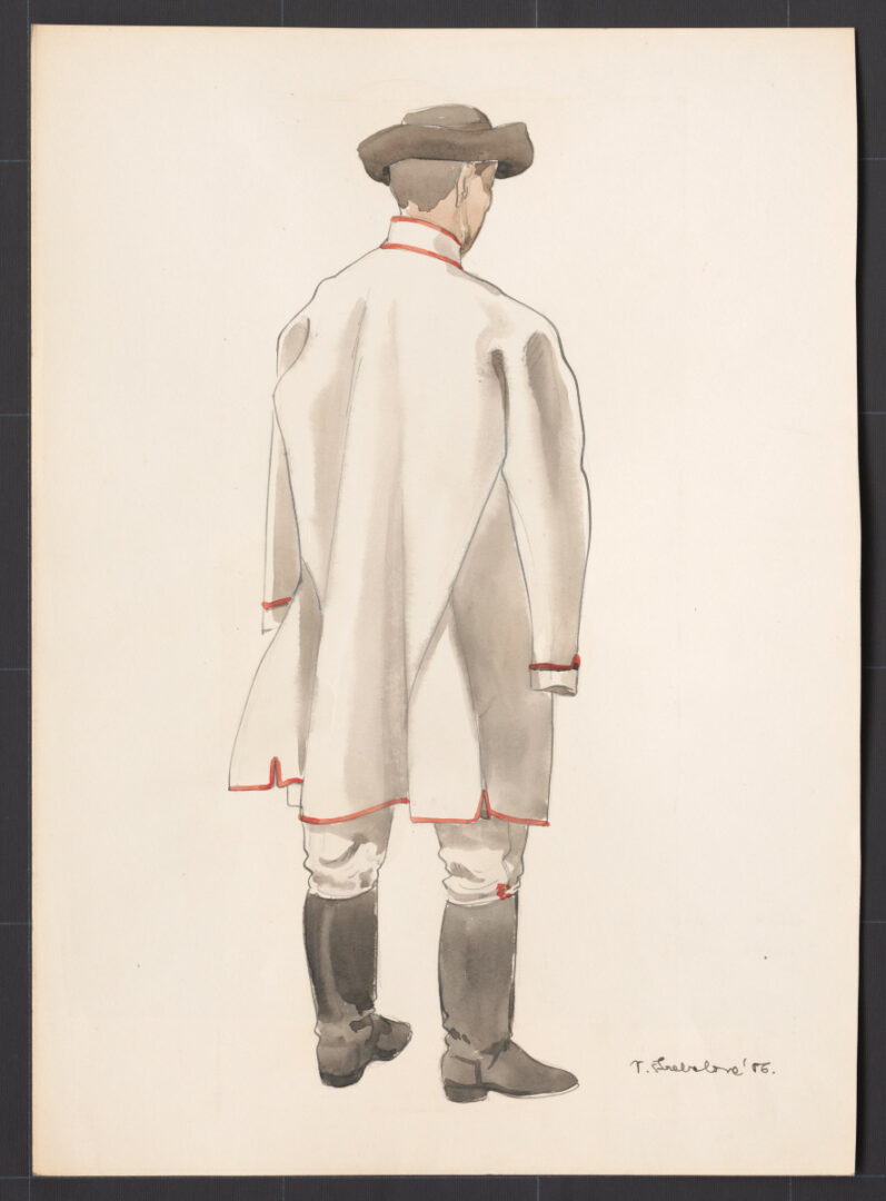 Odev muža v zimnom období, Lazisko, koniec 19. storočia. Muž má na základnom odeve, ktorý pozostáva z plátennej košele, zo spodných plátenných gatí, zo súkenných nohavíc a z kožušteka, cez plecia prehodenú dlhú kabanicu z bieleho súkna. Na hlave má trojrohý klobúk a na nohách čižmy. Na začiatku 20. storočia kabanicu nosili už len furmani na cestách, muži a mládenci do dažďa, prípadne pri práci mimo obce.