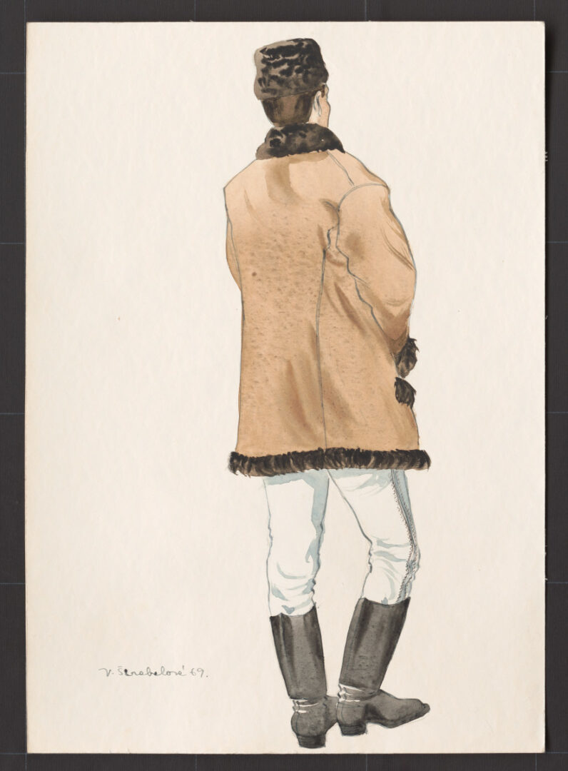 Vrchný odev muža v zimnom období, Sečovská Polianka, prvá polovica 20. storočia. Muž má pod kožuchom oblečenú bielu bavlnenú košeľu, spodné konopné gate, vrchné nohavice a kabátik z bieleho bavlneného kepra. Obuté má čižmy s tvrdými sárami. Na hlave má kožušinovú čiapku, baranicu. Takto oblečení bývali muži vo sviatočné dni v zime.