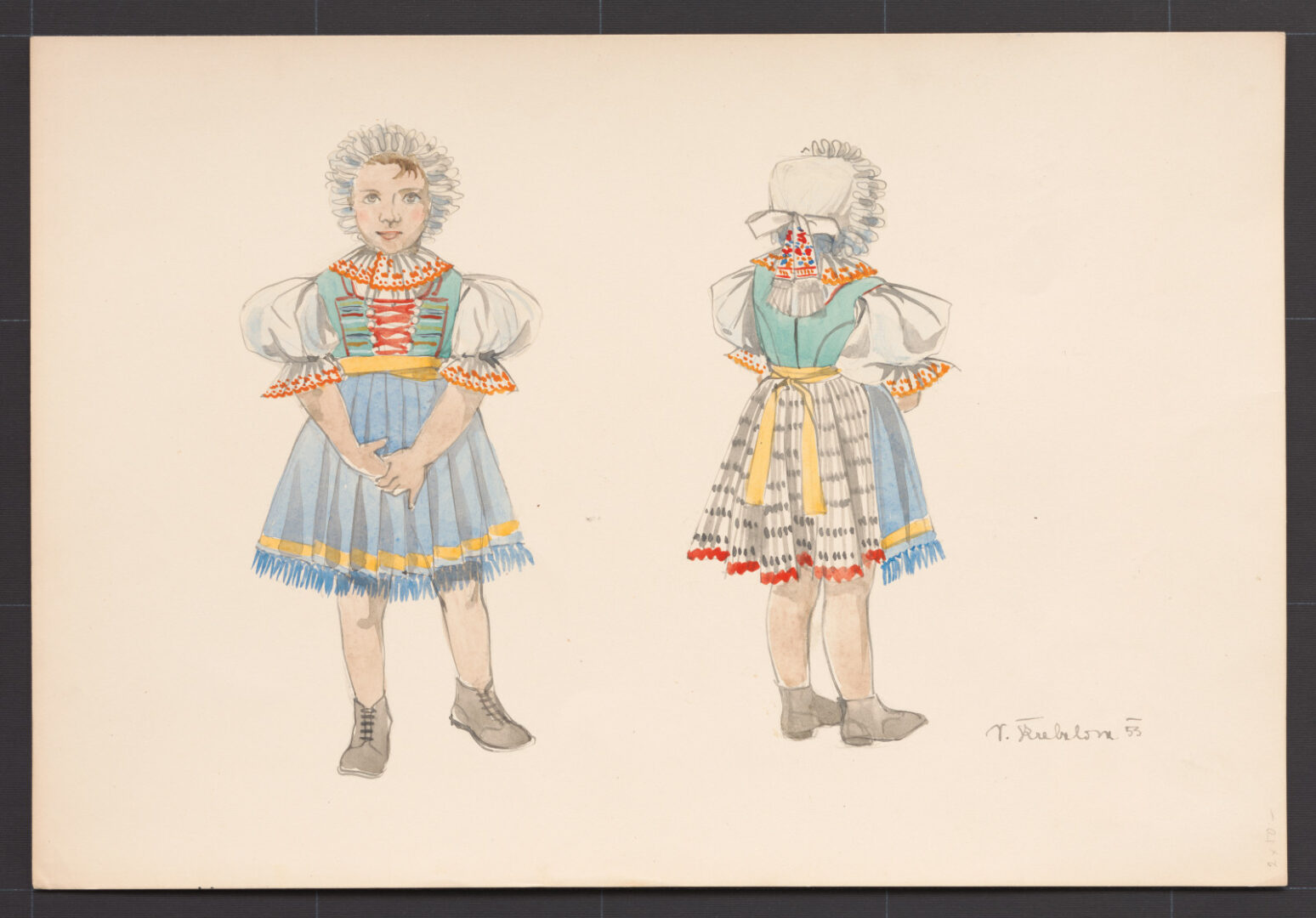 Sviatočný odev dievčatka, Senica, druhá štvrtina 20. storočia. Dievčatko má oblečený rubáš, rukávce s vyšitými zúbkami na koncoch rukávov (švinglové rukávce), bielu kartúnovú sukňu s drobným vzorom, zásteru a damaškový živôtik. Na hlave má uviazaný detský čepček. Už v predškolskom veku začali dievčatká nosiť vo sviatočné dni také isté odevné súčiastky ako slobodné dievčatá alebo mladé ženy.