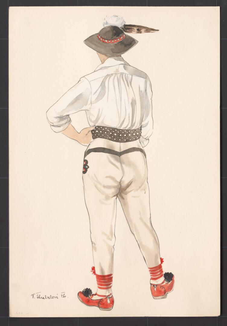 Sviatočný odev slobodného mládenca v letnom období, Suchá Hora, polovica 20. storočia. Mládenec má oblečenú košeľu mestského strihu z továrenského bavlneného plátna a súkenné nohavice (portky). Opásaný má kožený vybíjaný opasok. Na hlave má široký klobúk (kaňak), zdobený remienkom s našitými drobnými mušličkami a perom z orla, ktoré dopĺňa chumáč bieleho páperia z moriaka a veľká mušľa. Obuté má červené šité goralské krpce. Že ide o slobodného mládenca, dokladá výzdoba klobúka. Ženatí muži mali na klobúku len remienok s drobnými mušličkami. Na časové zaradenie odevu poukazujú vyšívané portky. Začiatkom 20. storočia mali portky podstatne jednoduchšiu výzdobu.