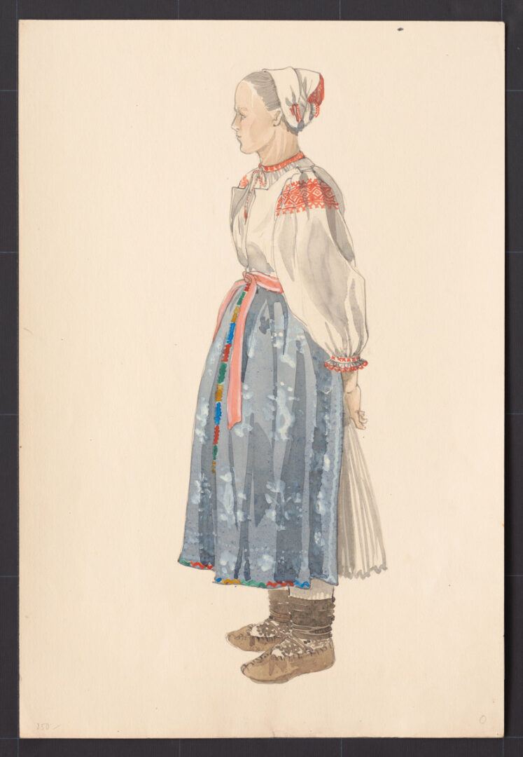 Sviatočný odev ženy v zimnom období, Fačkov, prvá štvrtina 20. storočia. Žena má oblečenú spodnicu, rukávce, bielu sukňu so živôtikom (kasanicu) a širokú modrotlačovú zásteru (záponku). Na hlave má čepiec s dlhou úzkou šatkou (podvikou). Obuté má kopytcia (nohavičky) a krpce. Vlnené kopytcia dokladajú, že ide o zimné obutie. Spodnica je dlhá plátenná košeľa bez rukávov, ktorá v období prvej štvrtiny 20. storočia nahradila nosenie rubáša. Svojím strihom pripomína rubáš. Takto oblečené bývali ženy vo všedné i sviatočné dni, iba s tým rozdielom, že vo sviatočné dni si obliekali nové a málo nosené odevné súčiastky.