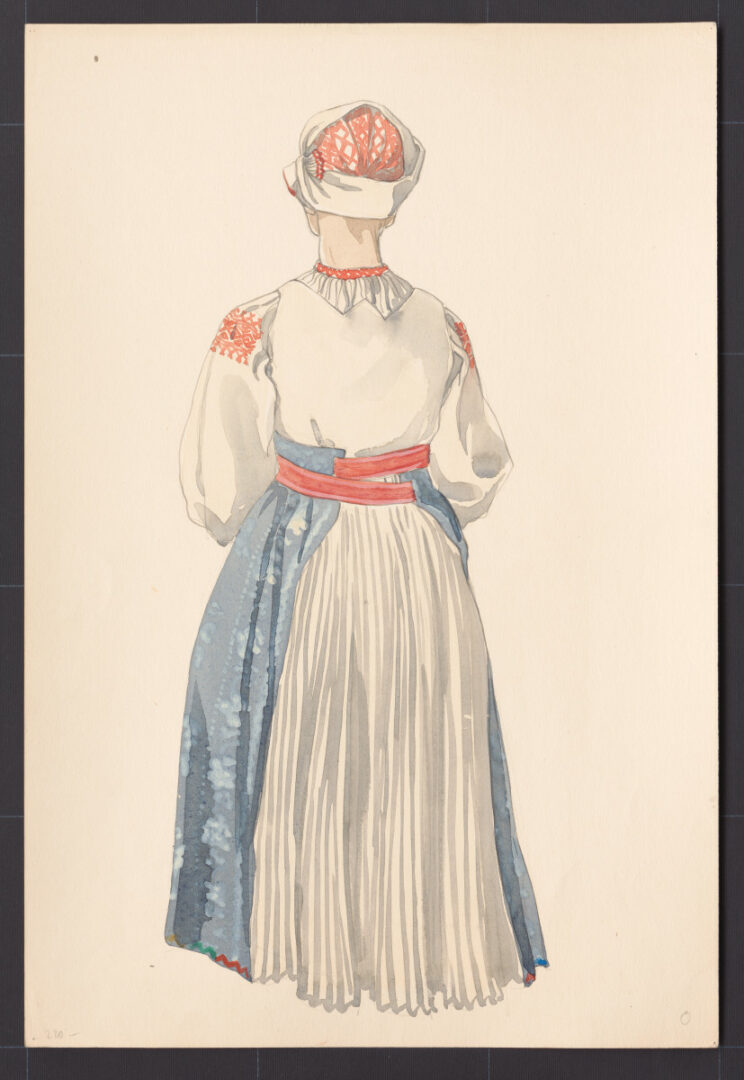 Sviatočný odev ženy v zimnom období, Fačkov, prvá štvrtina 20. storočia. Žena má oblečenú spodnicu, rukávce, bielu sukňu so živôtikom (kasanicu) a širokú modrotlačovú zásteru (záponku). Na hlave má čepiec s dlhou úzkou šatkou (podvikou). Obuté má kopytcia (nohavičky) a krpce. Vlnené kopytcia dokladajú, že ide o zimné obutie. Spodnica je dlhá plátenná košeľa bez rukávov, ktorá v období prvej štvrtiny 20. storočia nahradila nosenie rubáša. Svojím strihom pripomína rubáš. Takto oblečené bývali ženy vo všedné i sviatočné dni, iba s tým rozdielom, že vo sviatočné dni si obliekali nové a málo nosené odevné súčiastky.