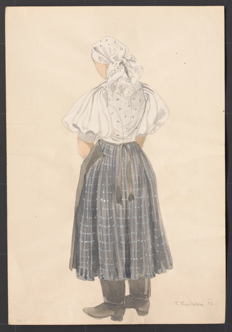 Všedný odev ženy, Lamač, začiatok 20. storočia. Pohľad zozadu. Žena má oblečený rubáš, šifónové rukávce s manžetami (lémečkové rukávce), modrotlačovú sukňu, živôtik (paladraj) z bieleho vzorovaného kartúnu a širokú zásteru z čierneho hrubšieho plátna. Na hlave má dozadu uviazanú šatku na hanáčku.