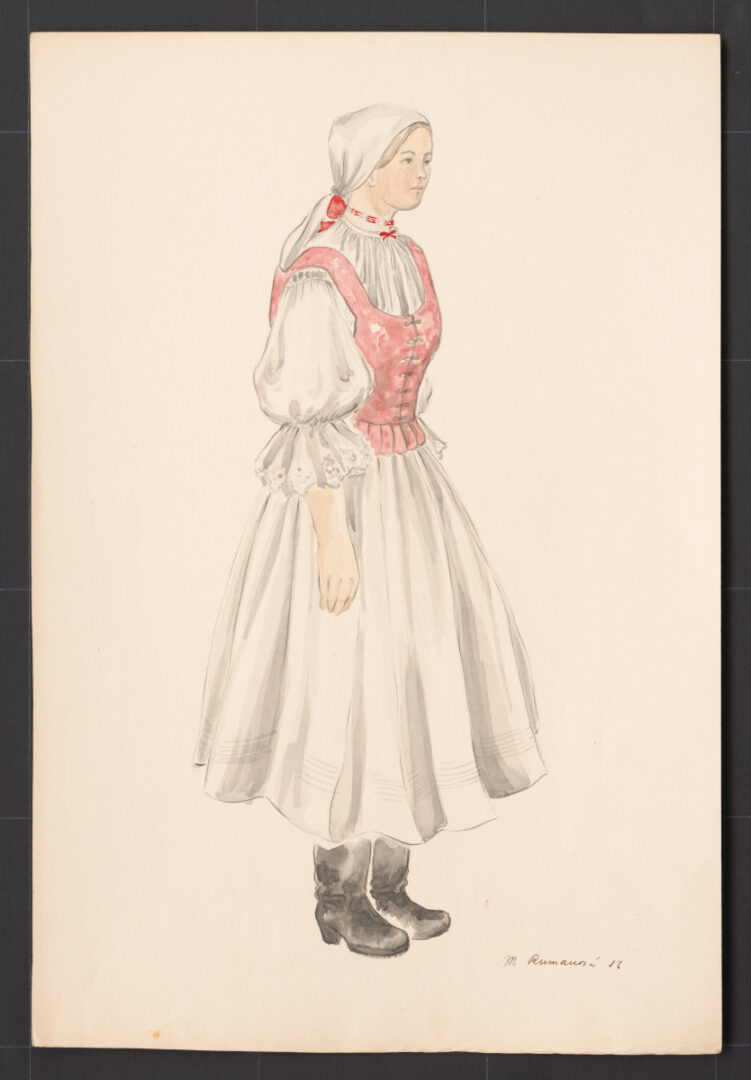 Sviatočný odev ženy v letnom období, Oščadnica, začiatok 20. storočia. Žena má oblečený rubáš, rukávce a sukňu (fortuch), všetko z domáceho ľanového plátna. Brokátový živôtik sa nosil zriedkavejšie, neexistovalo ani pravidlo, kedy sa má obliecť. Na sukni má žena opásanú zásteru (zopasku) z bieleho etamínu. Na hlave má na čepci uviazanú dlhú šatku (podvičku). Takto oblečené bývali vo sviatočné dni mladé ženy vo veku do tridsať rokov.